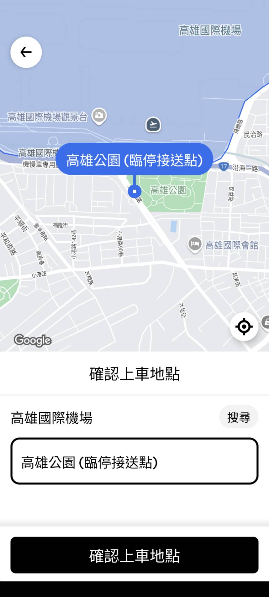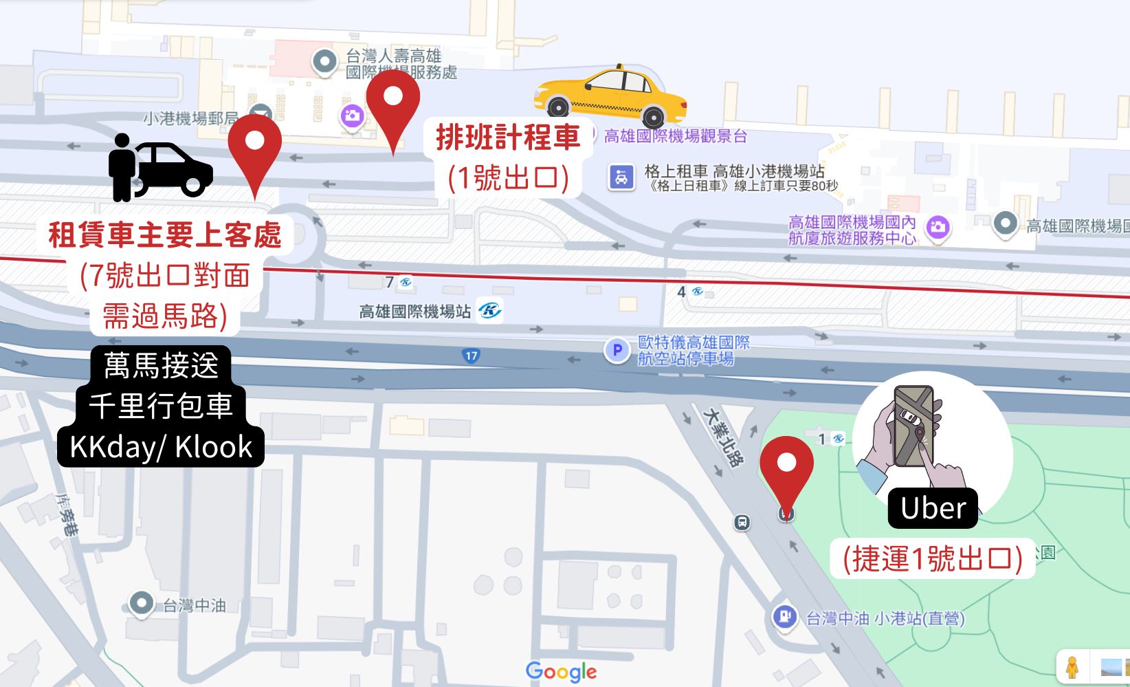 不過因為法規規定「非排班計程車」不能進小港機場接客,送機可以、接機只能在機場規定的「網約(多元)計程車上車處」上車。實際用Uber叫車,也會發現上車地點會自動跳到「高雄公園(臨停接送點)」,需從國際線入境大廳轉捷運地下道至1號出口、大業北路上,走路約需要10-15分鐘,相對比較不方便、對有大件行李的旅客來說較不友善。